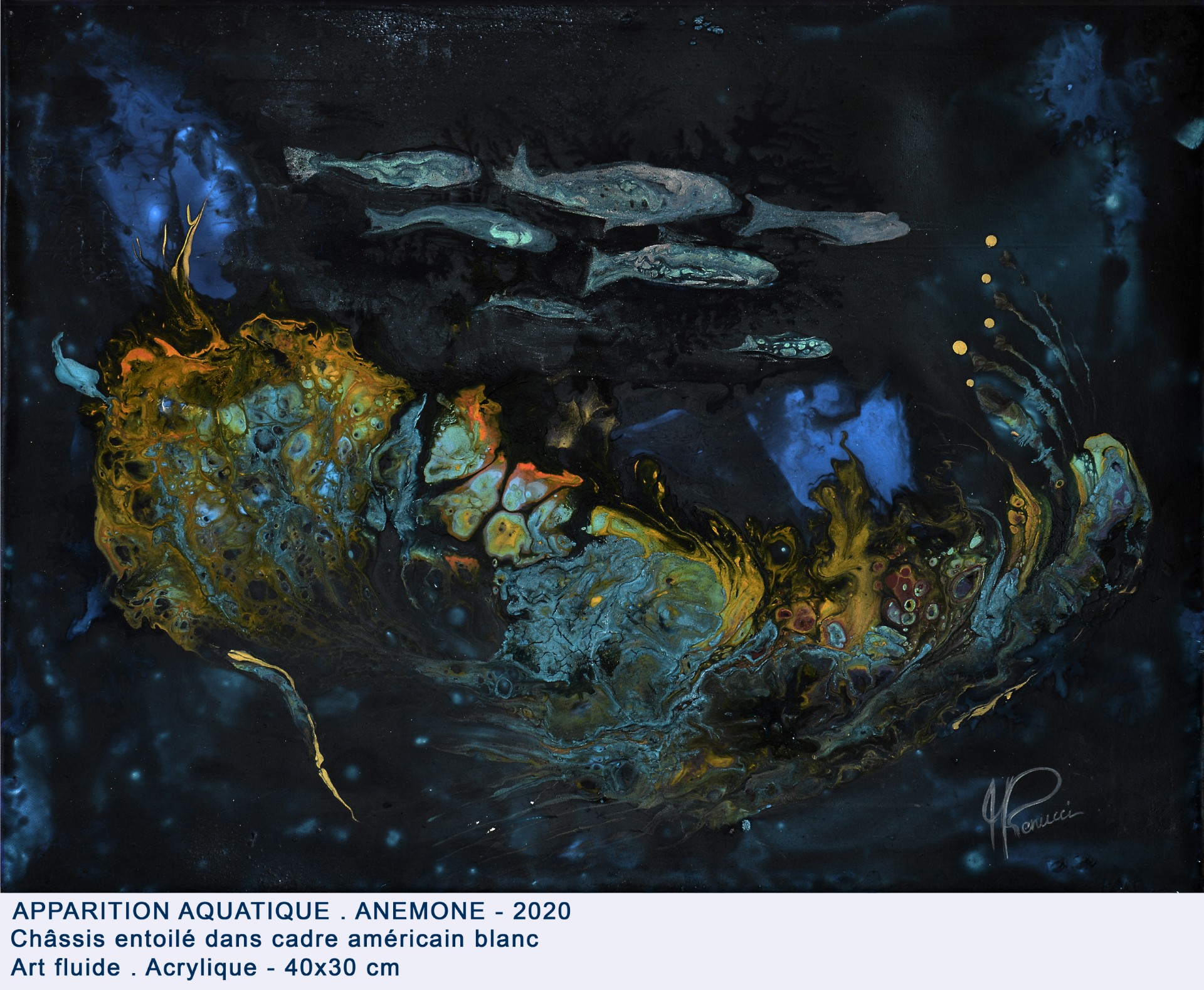 En 2018, une nouvelle étape commence avec la découverte de l’Art fluide. Elle l’intègre alors à ses expérimentations techniques : encres acryliques, résine, collages… De cette alchimie naissent ses fonds marins, véritables invitations à la plongée sensorielle. Le regard s’y perd, capté par un détail caché, une forme émergeant d’une cellule de peinture ou d’un rêve.