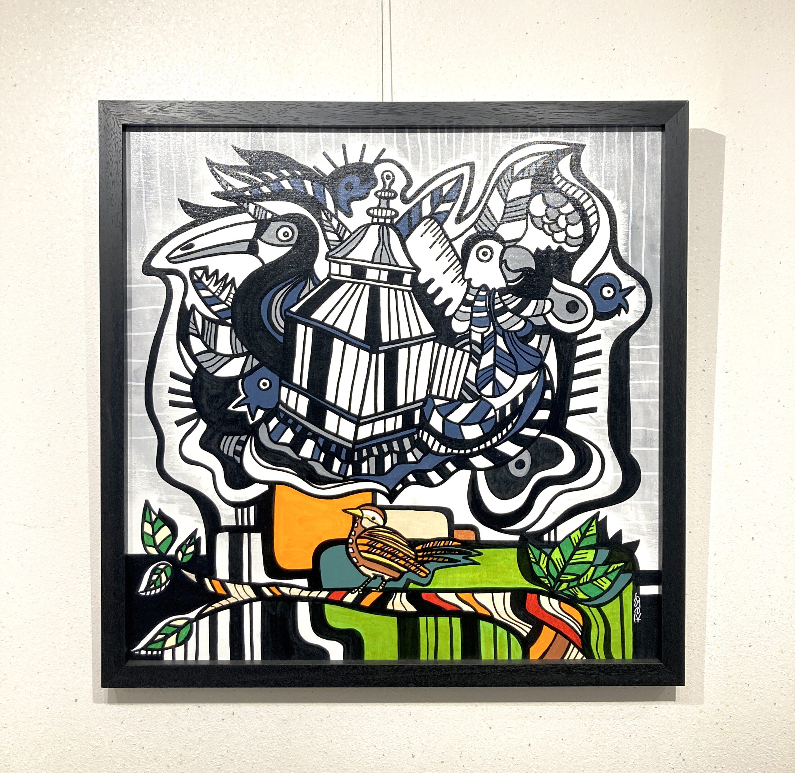 Mes scènes animales s’expriment dans un style figuratif haut en couleurs, inspiré d’une approche de « vitrailliste » et indéniablement marqué par mes origines malgaches. Aux dires du public, on y retrouve aussi de l’humour malgré la gravité parfois des sujets. Des paradoxes que j’adore provoquer !