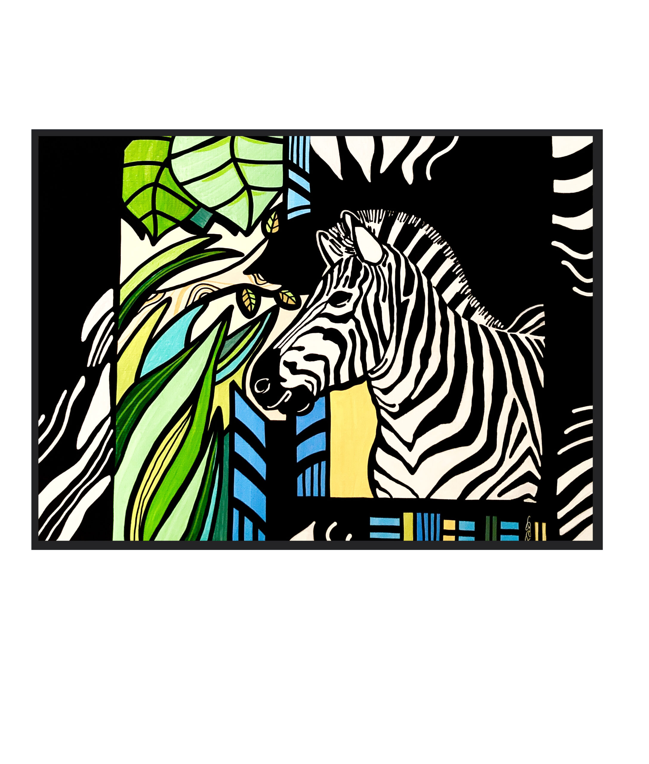 Mes scènes animales s’expriment dans un style figuratif haut en couleurs, inspiré d’une approche de « vitrailliste » et indéniablement marqué par mes origines malgaches. Aux dires du public, on y retrouve aussi de l’humour malgré la gravité parfois des sujets. Des paradoxes que j’adore provoquer !