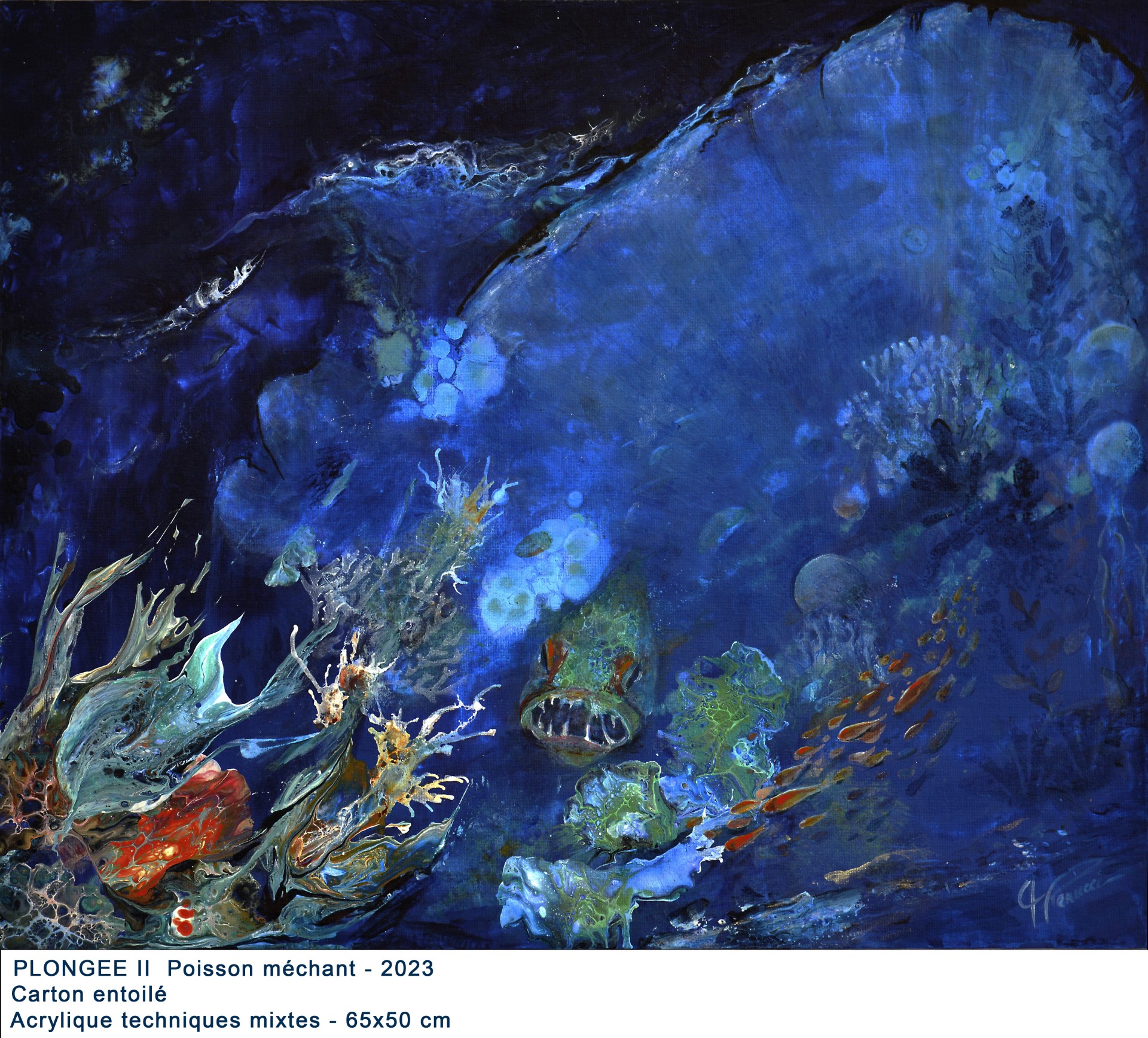 En 2018, une nouvelle étape commence avec la découverte de l’Art fluide. Elle l’intègre alors à ses expérimentations techniques : encres acryliques, résine, collages… De cette alchimie naissent ses fonds marins, véritables invitations à la plongée sensorielle. Le regard s’y perd, capté par un détail caché, une forme émergeant d’une cellule de peinture ou d’un rêve.