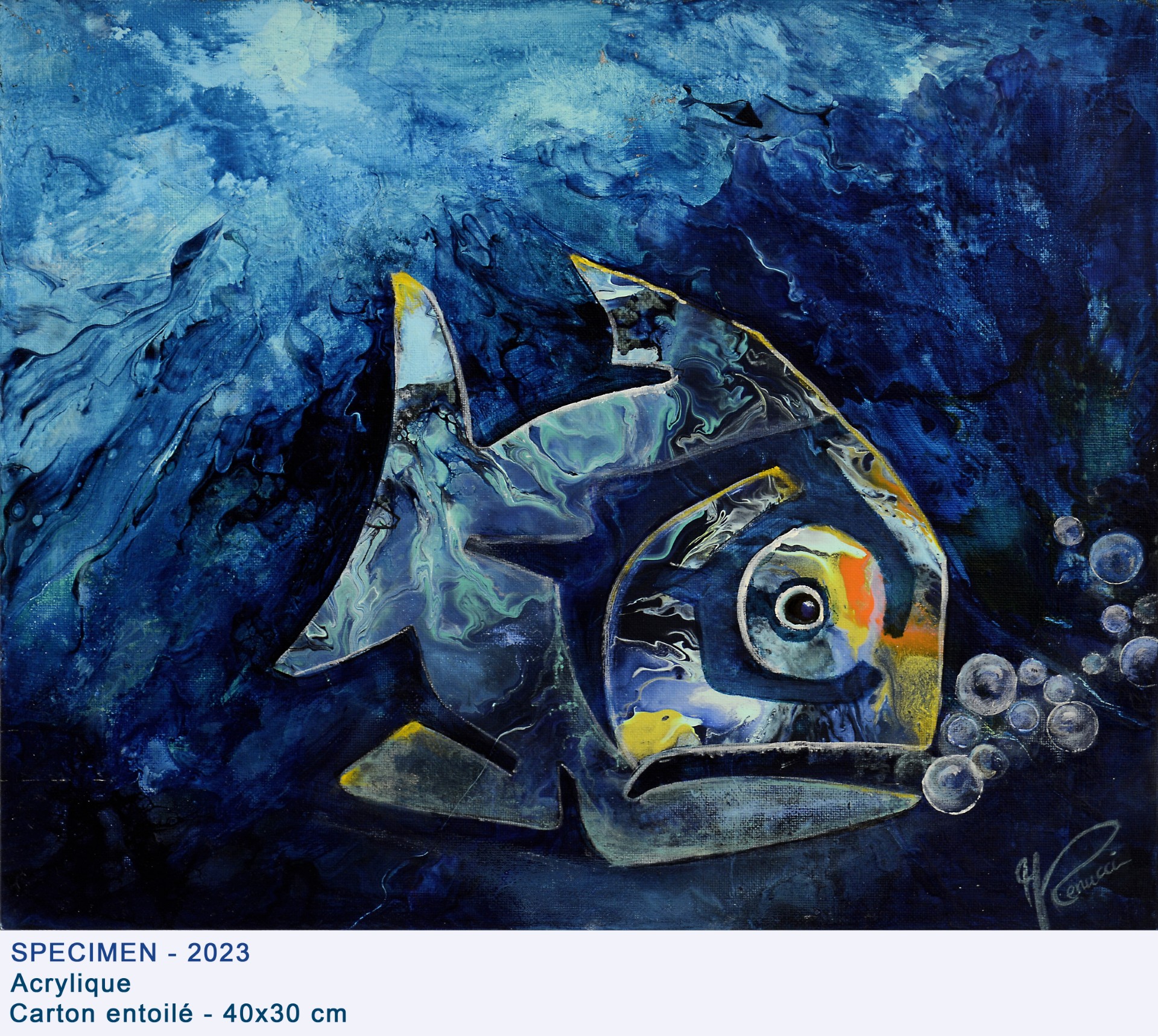 En 2018, une nouvelle étape commence avec la découverte de l’Art fluide. Elle l’intègre alors à ses expérimentations techniques : encres acryliques, résine, collages… De cette alchimie naissent ses fonds marins, véritables invitations à la plongée sensorielle. Le regard s’y perd, capté par un détail caché, une forme émergeant d’une cellule de peinture ou d’un rêve.